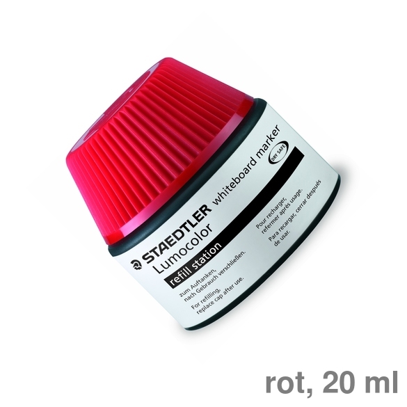 Tinte für Marker Lumocolor® refill station. Produktverwendung: Lumocolor® whiteboard marker 351. Art der Schreibflüssigkeit: Tinte, lichtbeständig gegeben. Efficient for ecology: Überfüllen ist unmöglich, da der Stift nur die maximal mögliche Tintenmenge aus der Tankstelle herauszieht, einfaches und sauberes Nachfüllen. Ausführung des Behälters: PP-Tank. Inhalt: 30 ml. Farbe: rot