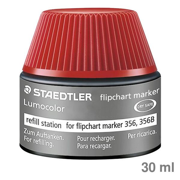 Tinte für Marker Lumocolor® refill station. Produktverwendung: Lumocolor® flipchart marker 356. Art der Schreibflüssigkeit: Tinte, lichtbeständig gegeben. Efficient for ecology: Überfüllen ist unmöglich, da der Stift nur die maximal mögliche Tintenmenge aus der Tankstelle herauszieht, einfaches und sauberes Nachfüllen. Ausführung des Behälters: PP-Tank. Inhalt: 30 ml. Farbe: rot