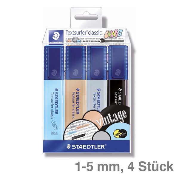 Textmarker Textsurfer® classic colors. Schattenfrei kopierbar. Inkjet geeignet. Strichstärke: samtweiche Keilspitze ca. 1 - 5 mm. Art der Schreibflüssigkeit: Leuchttinte, lichtbeständig gegeben. INK JET SAFE - alle Farben verwischen Inkjet-Ausdrucke und handgeschriebene Texte nicht, PP-Schaft garantiert lange Lebensdauer, Für Papier, Fax, und Durchschreibesätze. Farbe des Schaftes: entsprechend der Tintenfarbe. Clip vorhanden. Farbe: -305 himmelblau,-450 sand,-820 hellgrau,-9 schwarz. Ausführung des Inhalts mit Packung: transparente Box mit 4 Stück.