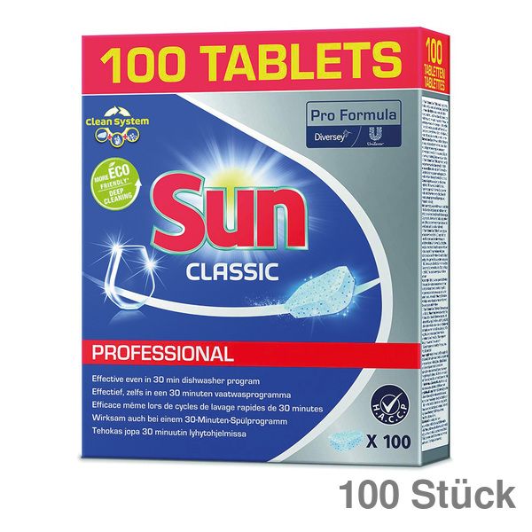 Sun Professional Classic Tabs entfernen mit ihrer extra starken Reinigungskraft Eingetrockentes, Stärke und Fett sowie Kaffee undTeeflecken restlos und sorgen für glänzendes Geschirr und strahlende Gläser. Gründliche Entfernung von Eiweiß und Stärke sowie Tee und Kaffeeflecken.
