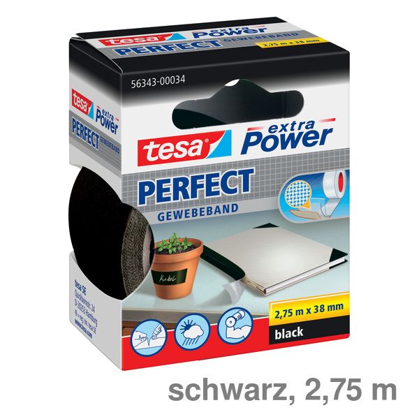 Gewebeklebeband tesa® extra Power Gewebeband. Einsatzbereich: Fixieren, Reparieren, Abdichten und Bündeln. Produktverwendung: auch für rauhe Untergründe geeignet. Bedruckbar. Wasserfest. Alterungsbeständig. UV-beständig. Power-Klebeband, Beschriftbar. Bandgröße (L x B): 2,75 m x 38 mm. Farbe: schwarz