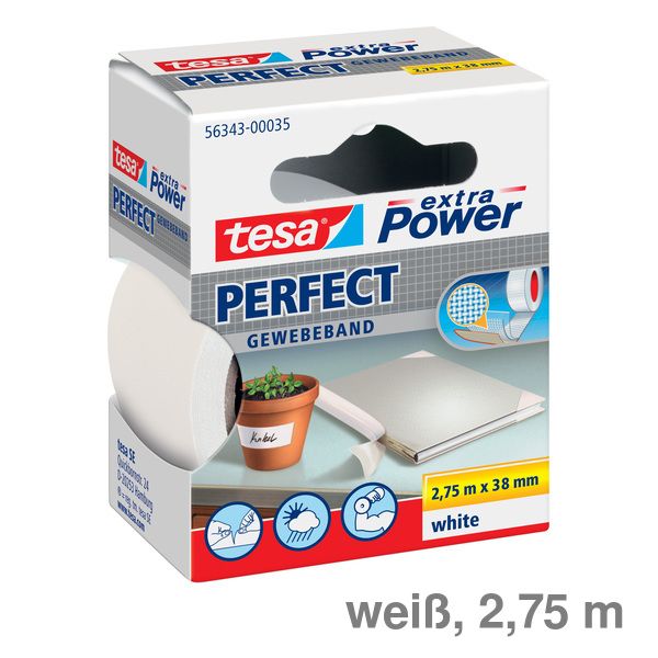 Gewebeklebeband tesa® extra Power Gewebeband. Einsatzbereich: Fixieren, Reparieren, Abdichten und Bündeln. Produktverwendung: auch für rauhe Untergründe geeignet. Bedruckbar. Wasserfest. Alterungsbeständig. UV-beständig. Power-Klebeband, Beschriftbar. Bandgröße (L x B): 2,75 m x 38 mm. Farbe: weiß