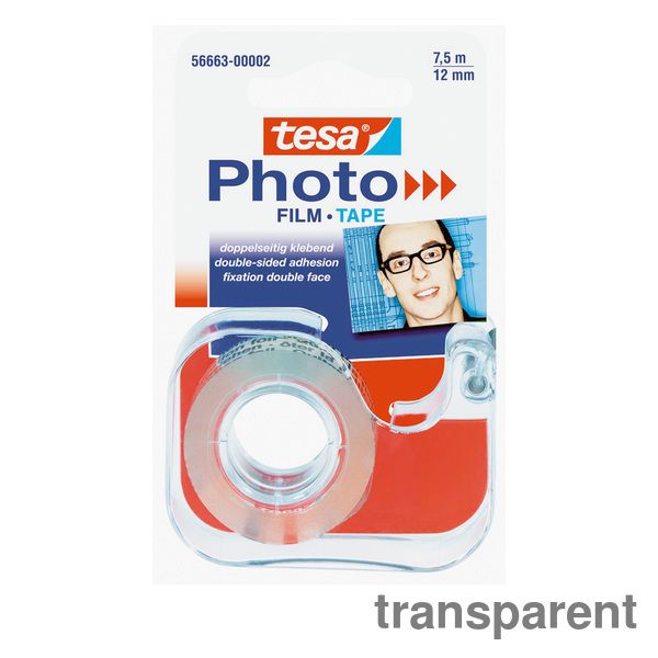 Abroller für doppelseitigen Klebefilm tesa® Photo Film. Nachfüllbar. Zum permanenten Verkleben von großformatigen Fotos und Dekorationsobjekten. Doppelseitig klebend, reissfest, auch für unebene Untergründe geeignet.. Bandgröße max. (L x B): 7,5 m x 12 mm. Gefüllt. Farbe: transparent.