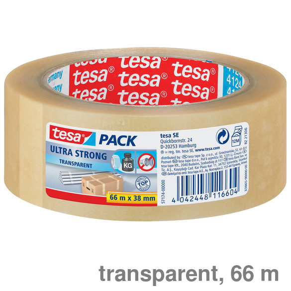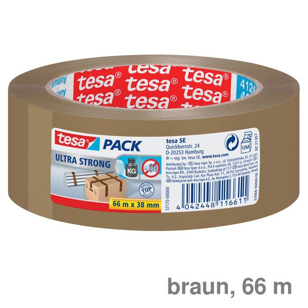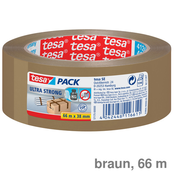 Verpackungsklebeband (Packhilfsmittel) tesapack® Ultra Strong. Werkstoff: PVC. Besonders reißfest. Bandgröße (L x B): 66 m x 38 mm. Ausführung: selbstklebend, Klebemasse lösungsmittelfrei. Reißfestigkeit: hoch. Trägermaterial: PVC. Abrollgeräusch: gering. Farbe: braun.