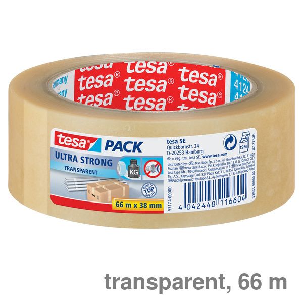 Verpackungsklebeband (Packhilfsmittel) tesapack® Ultra Strong. Werkstoff: PVC. Besonders reißfest. Bandgröße (L x B): 66 m x 38 mm. Ausführung: selbstklebend, Klebemasse lösungsmittelfrei. Reißfestigkeit: hoch. Trägermaterial: PVC. Abrollgeräusch: gering. Farbe: transparent.