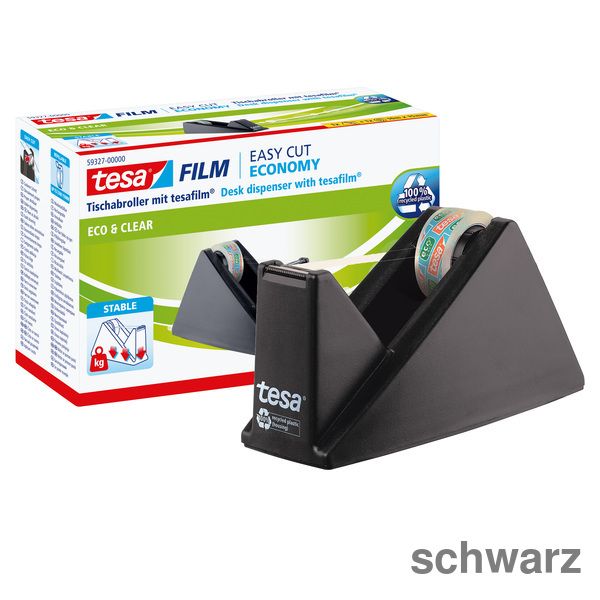 Tischabroller für Klebefilm tesafilm® Sparpack. Gefüllt. Sparpack: 1 Rolle Eco&Clear 10:15. Größe (B x H x T): 61 x 96 x 160 mm. Bandgröße max. (L x B): 10 m x 15 mm. Farbe: schwarz.