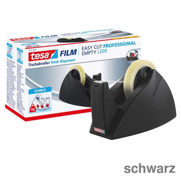 Tischabroller für Klebefilm tesa Easy Cut®. Messer auswechselbar. Standfest, sauberer Schnitt. Größe (B x H x T): 106 x 140 x 250 mm. Bandgröße max. (L x B): 66 m x 25 mm. Farbe: schwarz.