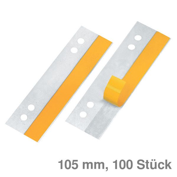 Heftstreifen HEFTFIX®. Selbstklebend. Werkstoff: PVC. Material der Deckschiene: Papier. Material des Aufreihbandes: Papier. Zum Abheften von Mustern, Urkunden, Zeichnungen, Bildern, Broschüren. Lochung: Lochabstand 60 und 80 mm. Größe (B x H): 30 x 105 mm. Farbe: glasklar.