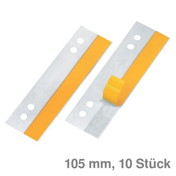 Heftstreifen HEFTFIX®. Selbstklebend. Werkstoff: PVC. Material der Deckschiene: Papier. Material des Aufreihbandes: Papier. Zum Abheften von Mustern, Urkunden, Zeichnungen, Bildern, Broschüren. Lochung: Lochabstand 60 und 80 mm. Größe (B x H): 30 x 105 mm. Farbe: glasklar.