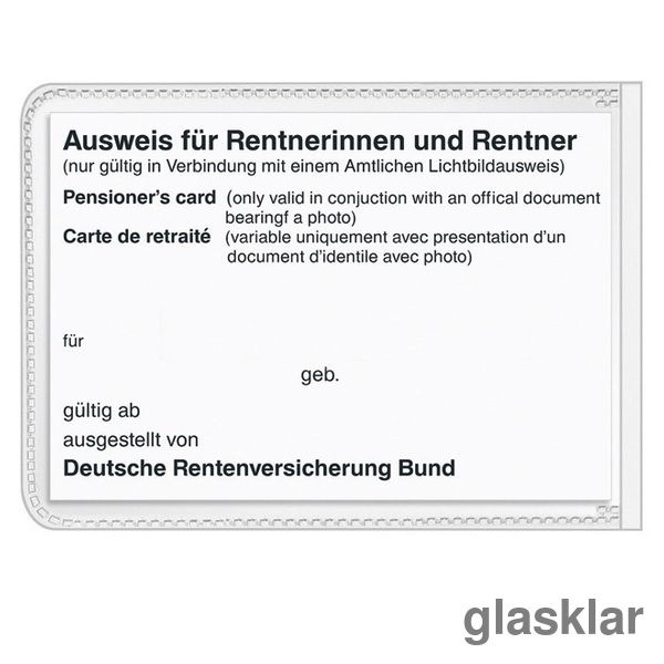 Schutz- und Ausweishülle, Innenmaß 66 x 90 mm, starke PP-Folie 170my, oben offen, Oberfolie verkürzt, dadurch leichteres Einstecken, mit Einreissschutz, passend für Führerschein, Kredit- und Scheckkarten, Krankenkassenkarte, Mitgliedsausweis, Rentenausweis, Kleinpackung, glasklar