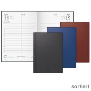 1 Tag/1 Seite, 3-spaltig, Sonn- und Feiertage hervorgehoben, Zinstagezählung. 416 Seiten, Telefon-/Adressverzeichnis. Fadengesiegelt. PEFC-zertifiziert. Viertelstundeneinteilung 7.30 - 20 Uhr. Wochenzählung. Kalendarium deutsch. Mit Eckperforation/zwei Lesezeichen. Einband aus Kunststoff, wattiert.