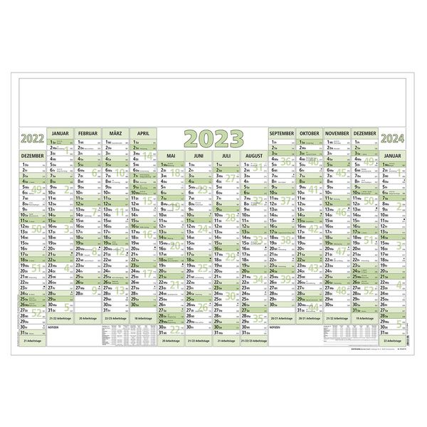 12 Monate/1 Seite, Sonn- und Feiertage hervorgehoben, Tageszählung, Ferientermine, Mondphasen, Druck: schwarz/grün. Arbeitstagezählung, Wochenzählung. Kalendarium deutsch. Größe: 880 x 630 mm (B x H). Tagesfeldgröße: 65 x 16 mm. Aus RC-Karton. Blauer Engel.
