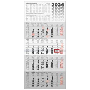 Querterminkalender 1 Woche = 2 Seiten, Sonn- und Feiertage hervorgehoben, Zweimonatsübersicht, Steuertermine. 120 Seiten, mit Vormerkkalender, Jahresübersichten, internationalen Feiertagen, Ferienterminen, Wissenswertes, Notizen, Anschriftenverzeichnis. Druck: schwarz/rot. Blattgröße: 300 x 100 mm (B x H). Spiralbindung. Stundeneinteilung 7 - 19 Uhr. Tages-, Wochen- und Zinstagezählung. Kalendarium deutsch, englisch, spanisch, italienisch. Einband aus Karton.